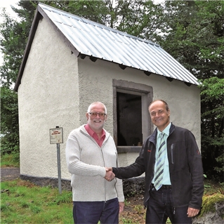 „Zunächst habe ich den Innenputz erneuert und renoviert. Den Außenputz wesentlich verbessert, die ganze äußere Dachkonstruktion mit Holzschutzlasur gestrichen“, so Wingender, der als große Hilfe den Syrier Hassan Salman dabei hatte, der ihm kräftig zur Hand ging. Des Weiteren schnitt Helmut Wingender, der auch als Flüchtlingspate aktiv ist, die Büsche rund um das kleine Bauwerk zurück, sodass es nun freistehend zu sehen ist. Dazu kam der Außenanstrich und diverse Details, wie das Holzrelief „Kompressorhaus“.