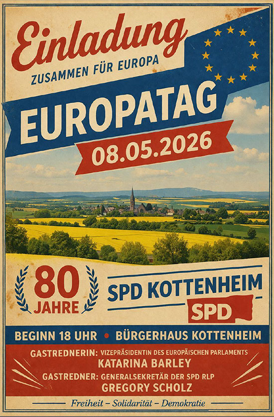Die SPD-Kottenheim freut sich auf Ihren Besuch am Freitag, den 8. Mai 2026 um 18:00 Uhr im Bürgerhaus Kottenheim, Schulstraße 12.